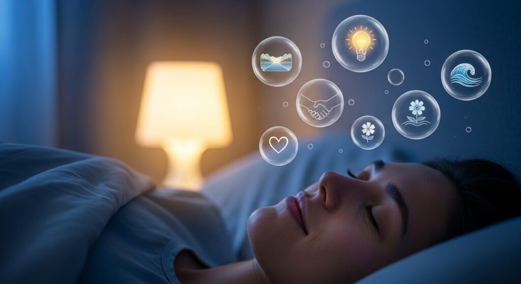 Phrases like restful sleep, peaceful dreams, and wake up refreshed direct attention toward relaxation.
